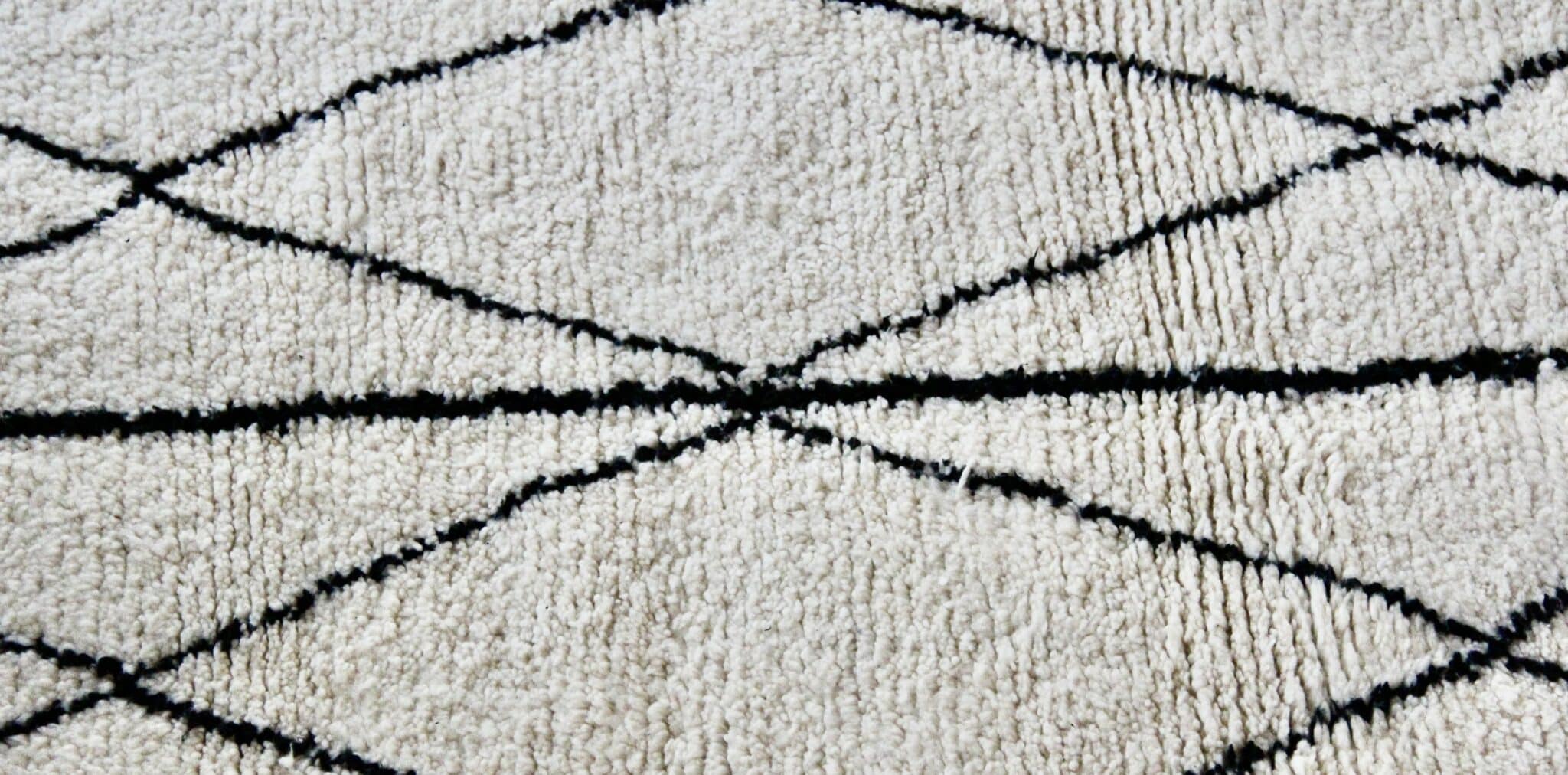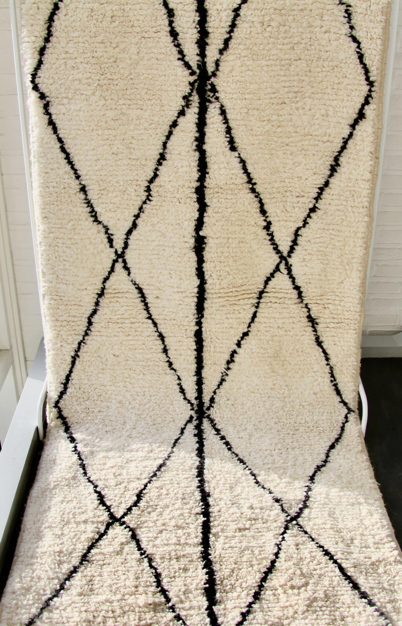 Langt Beni Ouarain tæppe – BOTRET med klassisk sort ruder mønstre.
