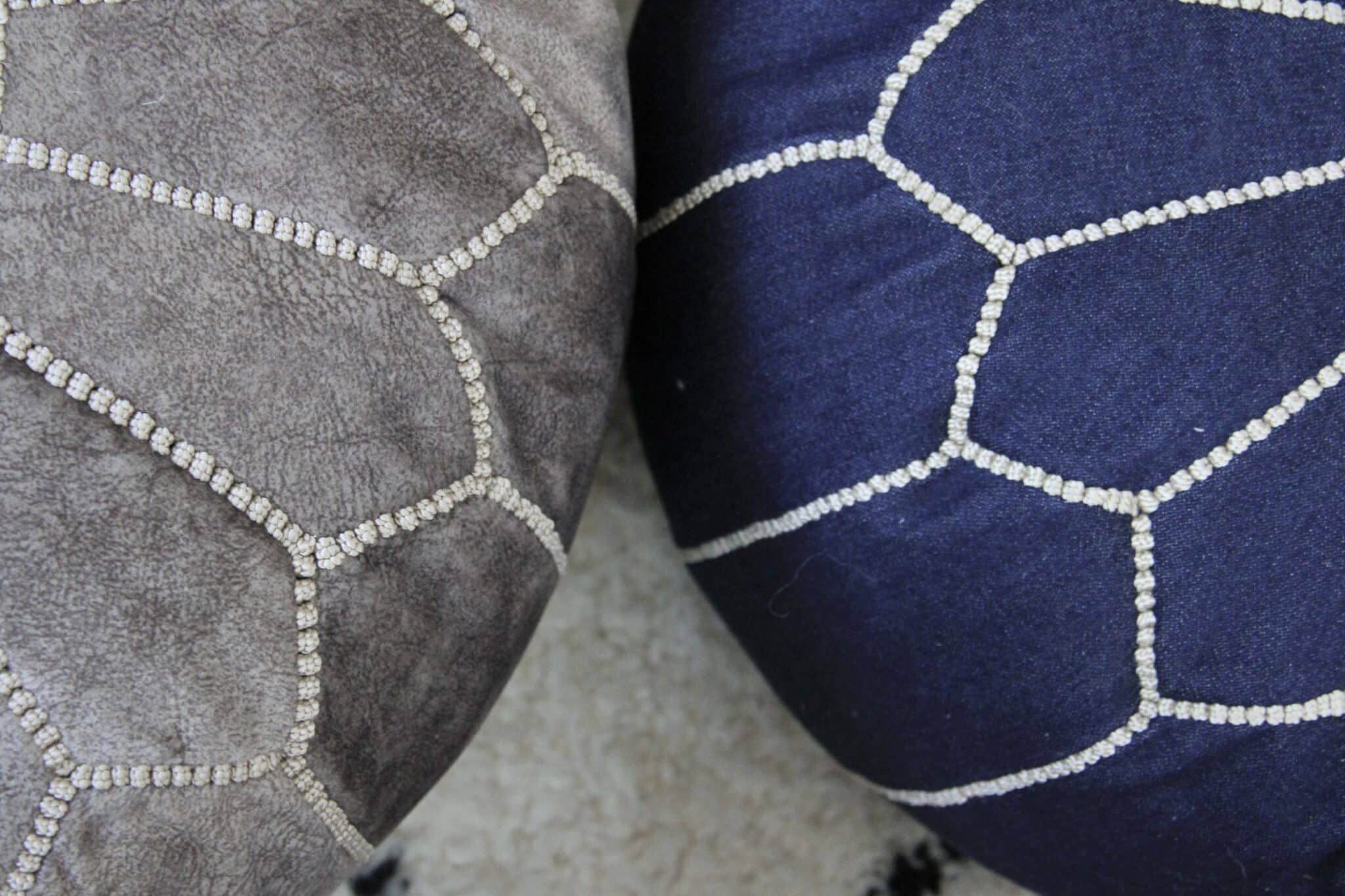 Marokkansk fløjl puf i lys sand med kraftige håndbroderede designs på overfladen.